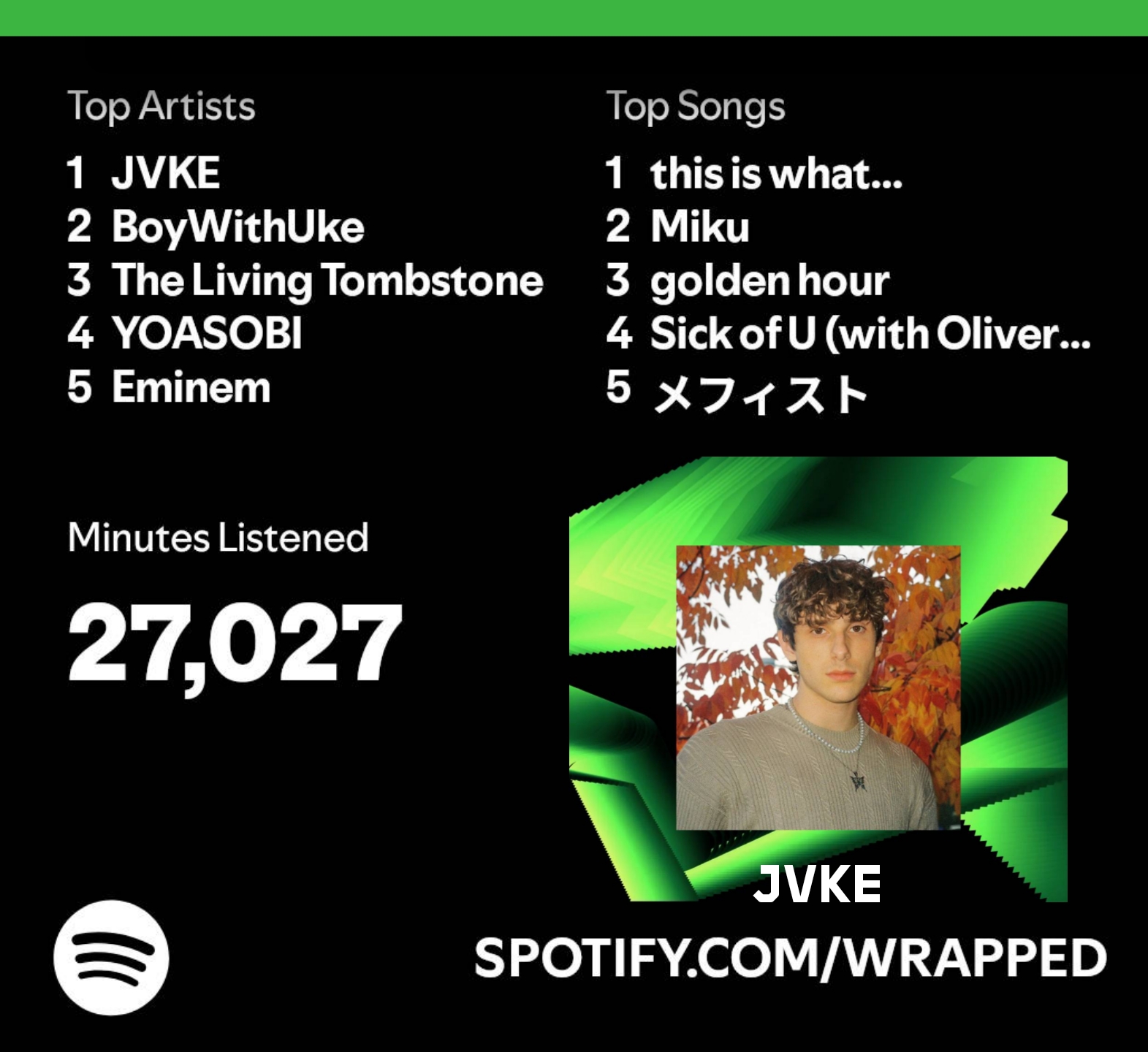 Check out my Spotify Wrapped, I thought it'd be fun to share here on Neocities! I listened to tons of music this year, and JVKE was my top artist – his songs are seriously awesome. You can see the rest of my list. See ya next year with another one (hopefully)!